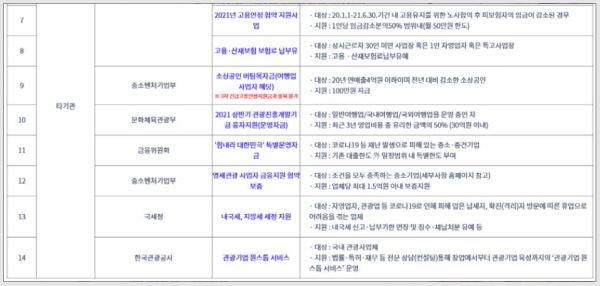관광업계에는 융자지원과 고용유지지원금 이외에도 업체당 100만 원의 '긴급생존자금'을 3월 중 현금으로 지원한다. 정부의 3차 재난지원금 대상에서 제외된 5인 이상 소기업을 중심으로 총 1500개사를 지원해 사각지대를 메운다. 지원금 사용도 사업비로 국한하지 않고 기업 생존에 필요한 운영자금 전반에 사용할 수 있도록 했다.