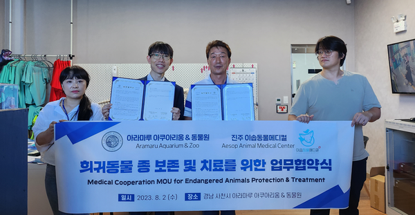 [위클리오늘=홍지훈 기자] 경남 진주 이솝동물메디컬(원장 황재민)과 사천에 소재한 아라마루 아쿠아리움(대표 김승민)이 지난 2일 아라마루 아쿠아리움에서 ‘희귀동물 종 보존 및 치료’를 위한 업무협약(MOU)을 맺었다.