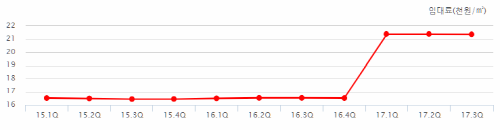 2017년 전국기준 소규모 상가 임대료는 제곱미터당 2만1390원으로 전년 동기대비 29.6% 상승했다.