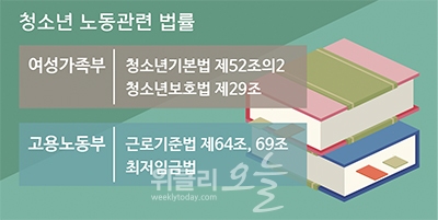 청소년의 권익보호는 청소년기본법과 청소년보호법에서 규정되지만 노동관련 법규 위반의 경우 신고에 의해 최저임금법과 근로기준법에 따라 처리하게 돼 있다.