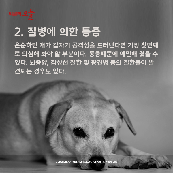 온순하던 개가 갑자기 공격성을 드러낸다면 가장 첫번째로 의심해 봐야 할 부분이다. 통증때문에 예민해 졌을 수 있다. 뇌종양, 갑상선 질환 및 광견병 등의 질환들이 발견되는 경우도 있다.