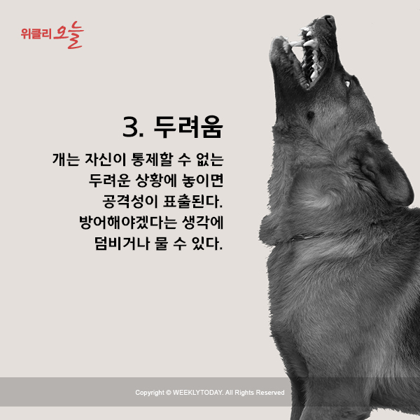 개는 자신이 통제할 수 없는 두려운 상황에 놓이면 공격성이 표출된다. 방어해야겠다는 생각에 덤비거나 물 수 있다.