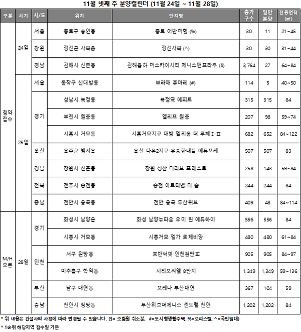 21일 부동산 전문 리서치업체 리얼투데이에 따르면 11월 넷째 주에는 전국 11곳, 총 2080가구(조합원 취소분·도시형생활주택·오피스텔·국민임대 포함, 행복주택 제외)의 청약 접수가 진행된다.