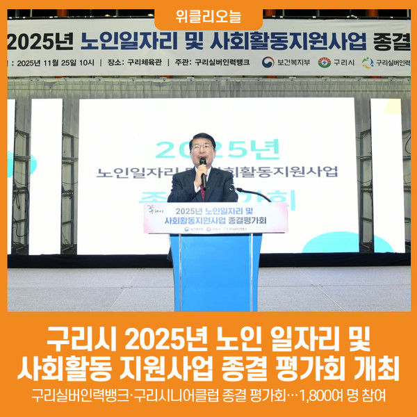[경기 위클리오늘=박종국 기자] 구리시는 ‘구리실버인력뱅크’가 11월 25일 오전 10시에, ‘구리시니어클럽’이 같은 날 오후 3시에 구리시 시립체육관에서 ‘2025년 노인 일자리 및 사회활동 지원사업’ 종결 평가회를 개최하며 한 해 사업을 성공적으로 마무리했다. 이번 평가회에는 노인 일자리 참여자 1,800여 명이 참석했다.
