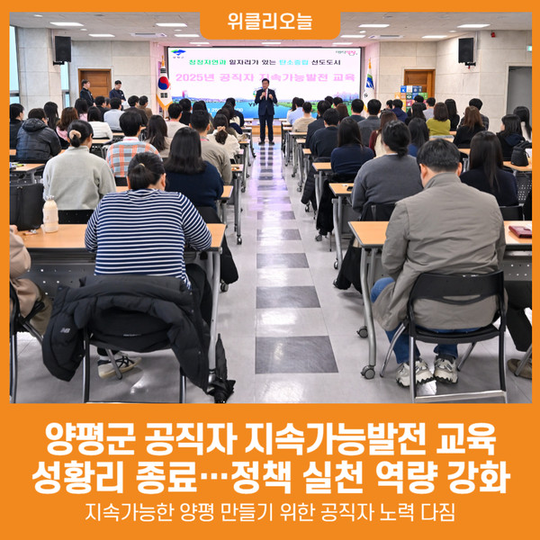 [경기 위클리오늘=박종국 기자] 양평군은 지난 25일 오전 10시 군청 대회의실에서 ‘2025년 공직자 지속가능발전 교육’을 실시했다. 이번 교육에는 양평군수를 비롯한 군 공직자 96명이 참석했으며, 이 중 약 60%는 신규 임용자이다.