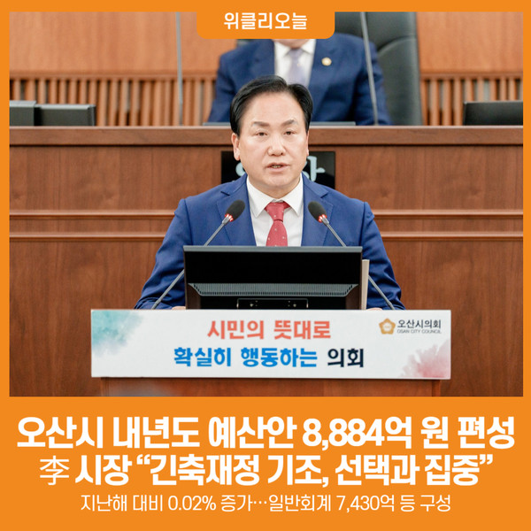 [경기 위클리오늘=박종국 기자] 오산시는 8천884억8천만 원 규모의 내년도 예산안을 편성해 오산시의회에 제출했다.