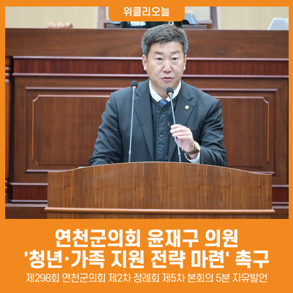 [경기 위클리오늘=우서연 기자] 연천군의회 윤재구 의원은 지난 25일 제298회 제2차 정례회 제5차 본회의 5분 자유발언을 통해 연천군이 직면한 청년 인구 유출과 저출산 문제를 지적하며, 장기적이고 지속 가능한 청년·가족 지원 전략 마련을 촉구했다.