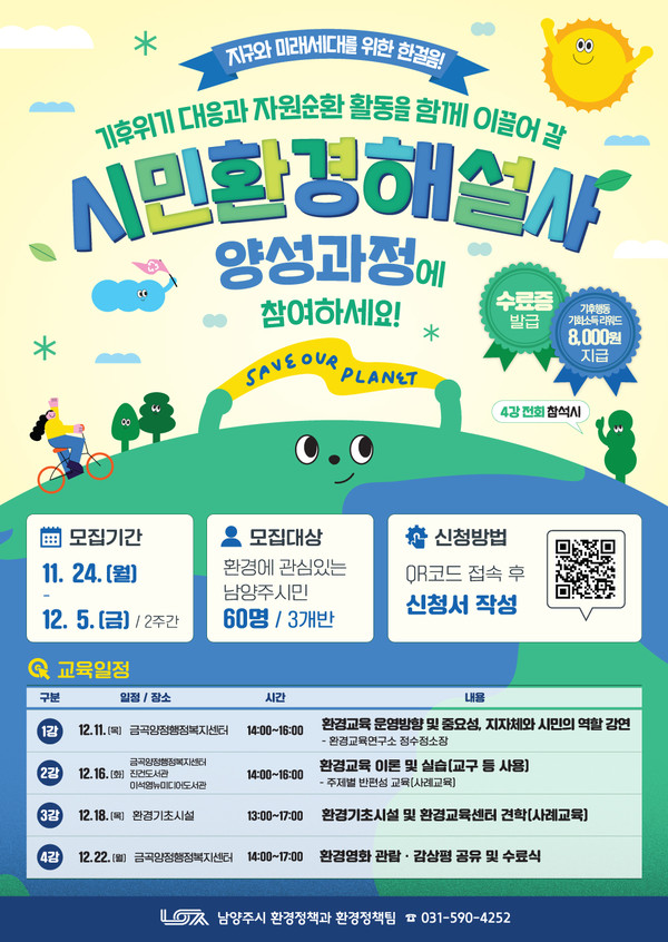 [경기 위클리오늘=박종국 기자] 남양주시는 11월 24일부터 12월 5일까지 기후위기 대응과 자원순환 실천문화를 확산하기 위한 ‘시민환경해설사 양성과정’ 참여자를 모집한다. 이번 교육은 미래세대를 위한 지속가능한 환경문화를 시민과 함께 만들어 가기 위한 프로그램으로, 환경에 관심 있는 시민 누구나 참여할 수 있다.